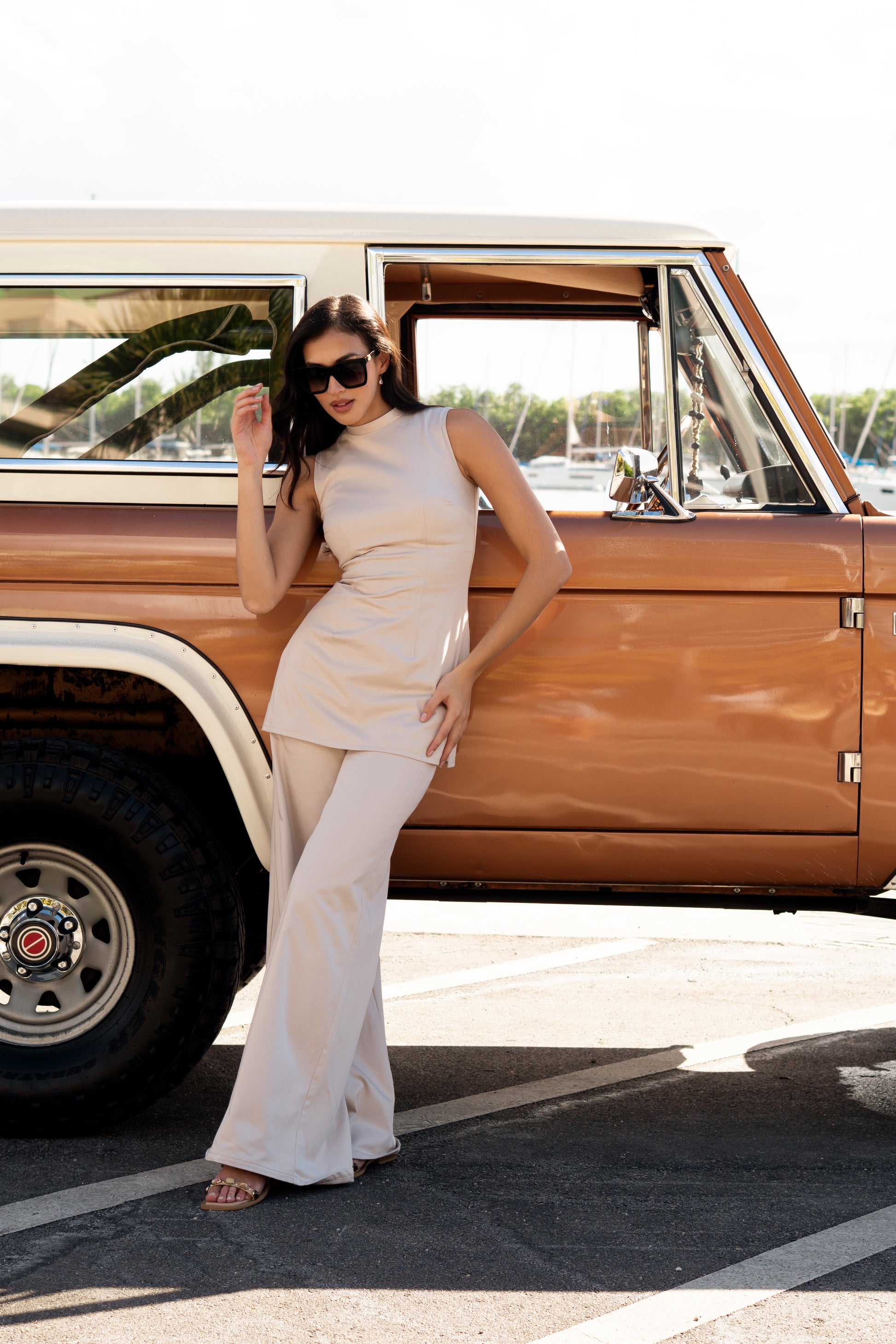 The Tate Trouser is tailored to a sleek, modern fit. Designed with a high-rise silhouette and wide legs for a contemporary look. Designed with side pockets and a back zipper for a seamless appearance, the Tate Trouser offers a refined yet versatile style.